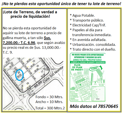 LOTE EN VENTA 390M2 enmallado, zona con alcantarillado, cerca del pavimento, mercado, colegio ,clínica, 7timo anillo cerca Av.Bolivia papeles al día 38000 $us en 7 Bs el cambio propietario 68824931