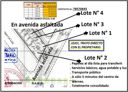 Tenemos lotes de terreno en zona estratégica a 3 minutos del centro de la Ciudad de Warnes, ubicado en la Comunidad “El Jipa”, que empieza desde la carretera asfaltada Warnes-Tajibo-Okinawa. Tenemos ventas al contado y al... leer más ⟶